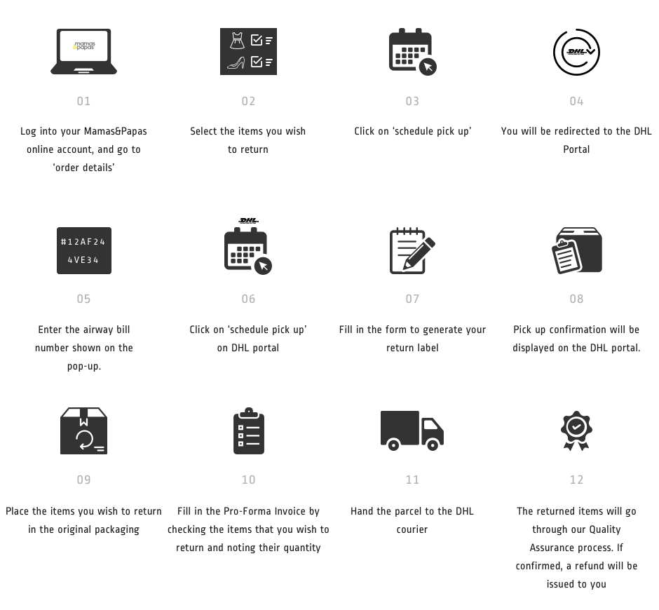 - contacting us by calling +96824442641 to arrange collection of the item from your delivery address in Oman. A collection fee equivalent to the original delivery charge will apply unless the returned item was defective or incorrectly fulfilled; or If you are returning the item directly to a Mamas & Papas store in Oman, you will also have the option to replace it subject to stock availability and price adjustment (where applicable). This is applied on full price items only, and not on sale items.